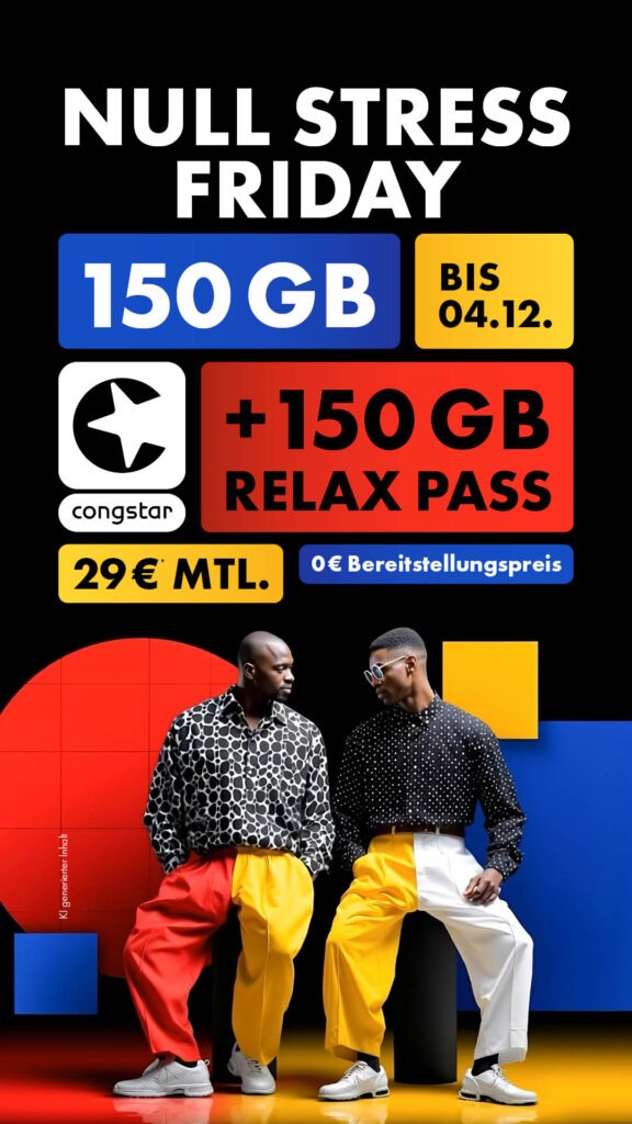 2) Aktion für Neukunden bis zum 04.12.2025: Die congstar Allnet Flat L mit GB+ kostet monatlich 29 €. Mindestvertragslaufzeit 24 Monate. Einmaliger Bereitstellungspreis 0 €. Die Bandbreite wird ab 150 GB im jeweiligen Monat von max. 50 Mbit/s im Download und 25 Mbit/s im Upload auf max. 32 Kbit/s im Download und Upload beschränkt. Voraussetzung für das Surfen im 5G-Netz ist ein 5G-fähiges Endgerät. GB+: Das monatliche Datenvolumen erhöht sich im Tarif Allnet Flat L alle 12 Monate um jeweils 10 GB. Bei Tarifwechsel in einen anderen Tarif gelten die Konditionen des neuen Tarifes. Relax Pass: Der Relax Pass ist in der Allnet Flat M und L einmal pro Monat ab einem Verbrauch von 80% des Inklusivdatenvolumens für 0 € aktivierbar, um das Inklusivdatenvolumen deines Tarifs erneut hinzuzubuchen. Dieses ist sofort bis zum jeweiligen Monatsende mit der vereinbarten Übertragungsgeschwindigkeit nutzbar. Nicht genutztes Datenvolumen verfällt danach. Nach Verbrauch deines Gesamtdatenvolumens, bestehend aus Relax Pass und Inklusivdatenvolumen wird die Bandbreite auf max. 32 Kbit/s im Down- und Upload beschränkt. congstar – eine Marke der Telekom Deutschland GmbH, Bayenwerft 12-14, 50678 Köln.