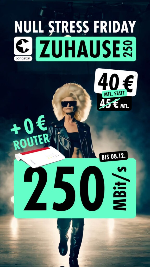1) Bei Neubuchung bis zum 8.12.2025 kostet congstar Zuhause 250 40 € statt 45 €/Monat. Ein für die Tarifnutzung erforderliches Endgerät ist im Rahmen der Aktion für 0 € mtl. zubuchbar. Kündigungsfrist: Zwei Wochen zum Monatsende. Kein Bereitstellungspreis. congstar Zuhause 250 ermöglicht eine Datennutzung von max. 250 Mbit/s im Download und 40 Mbit/s im Upload und ist in vielen Anschlussbereichen verfügbar. Ohne Festnetz-Telefonie. Alle Preise inklusive Umsatzsteuer. congstar – eine Marke der Telekom Deutschland GmbH, Bayenwerft 12-14, 50678 Köln.